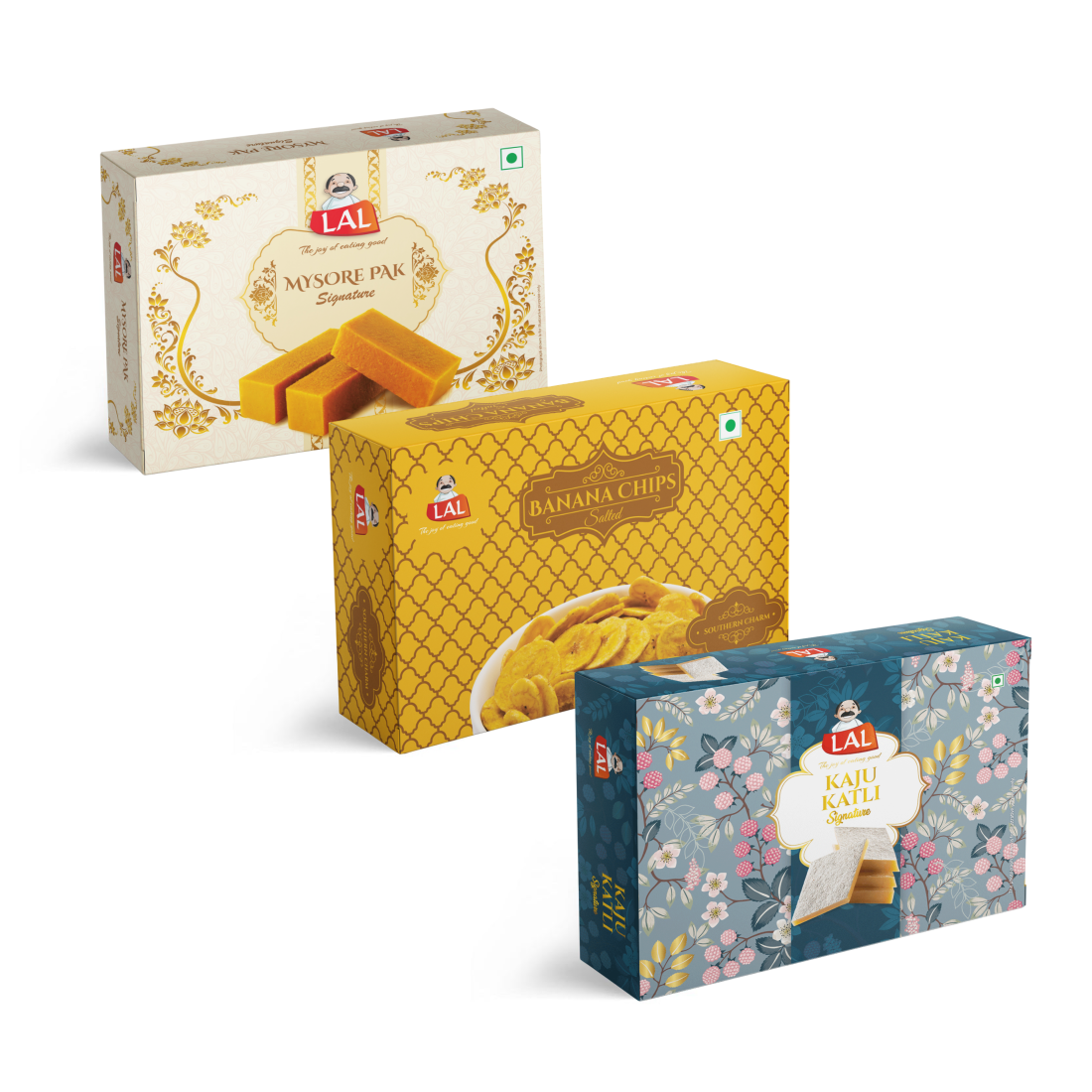 Mysore pak signature 400g, Banana chips salted 250g and Kaju katli 400g
