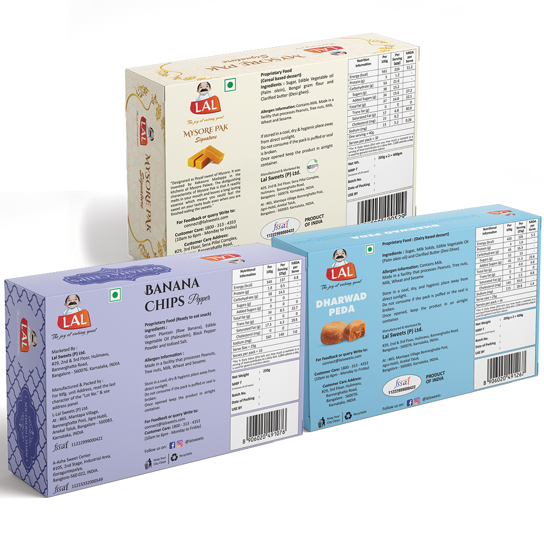 Mysore pak signature 400g, Dharwad peda 400g, Banana chips pepper 250g