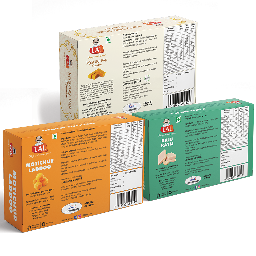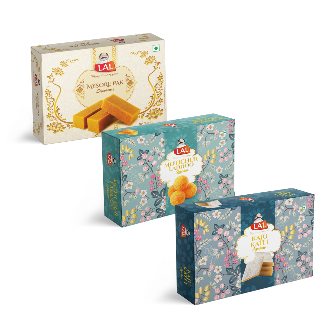 Combo Delight: Enjoy the deliciousness of Royal Mysore pak, Motichur laddoo, and irresistible Kaju katli in one convenient package. Whether it's a festive occasion or any special moment, this combination is sure to add joy to your celebrations.